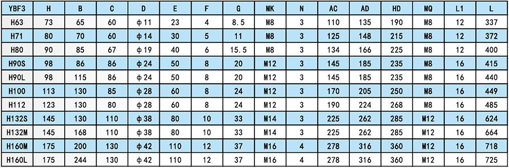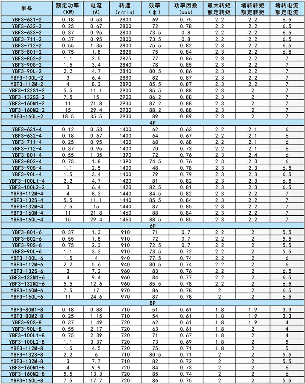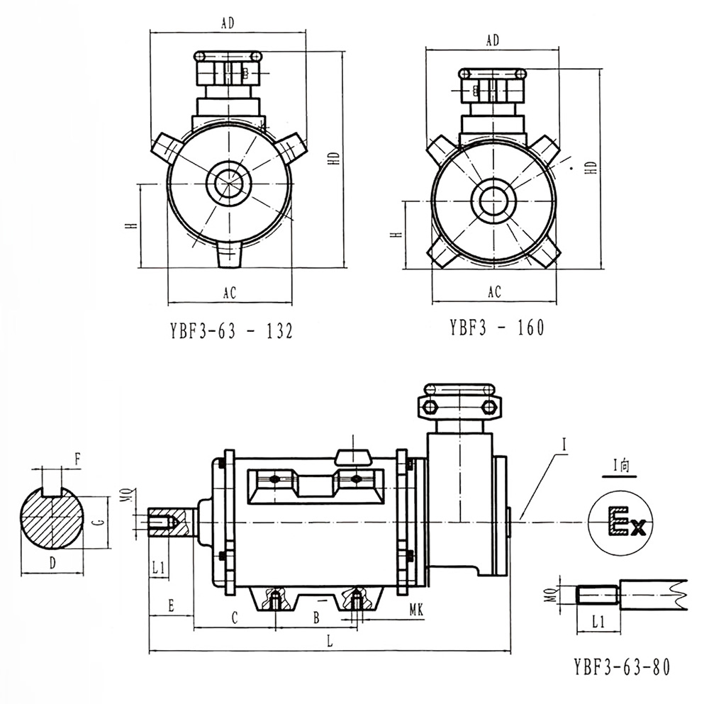 YBF3 explosion-proof motor is a new product designed and developed for ventilation fan. It has the characteristics of small size, light weight, high efficiency, low noise, low vibration, safe and reliable operation, easy operation and maintenance. YBF3 explosion-proof motor power level and installation dimensions conform to National Standards and the International Electrotechnical Commission IEC standards, reach the  domestic first-class technical level. YBF3 flameproof three-phase asynchronous motor for fans implement the standard GB3836.2 Explosive Atmosphere Electrical Apparatus, Part 2,  Apparatus with Flameproof Type “d” Enclosure , MT451-1995 Flameproof Low-voltage Three-phase Asynchronous Motor for Coal Mine General Technical Specification for Safety Performance". The main performance is in line with the provisions of "Flameproof three-phase asynchronous motor Technical conditions Part 5 YBF3 series fan flameproof three-phase asynchronous motor (frame No. 63-355)", the explosion-proof mark is Exdb LBT4, EXLBT4(original mark Exd). it mainly used as the prime motor of the fan. It is suitable for the place where the non-mining surface of coal mine has methane flammable gas or the explosive gas environment formed between coal mine and air.